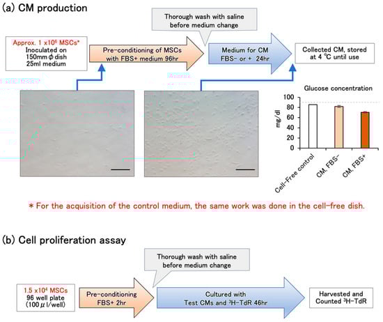 (a) Schematic illustration of CM production. The total thawed cells recovered from a cryopreservation tube (approximately 1 × 106 cells) were directly seeded on a 150 mm-diameter dish at a density as shown in Table 1 (#PT-5006: 7318 ± 99 cells/cm2, KW-4209: 6310 ± 310 cells/cm2) and cultured for 96 h with the FBS-containing MEMα medium. Then, the medium was changed to produce CM. The photos show phase contrast images of cultured KW-4209 cells at the points indicated by the arrows 2 h after seeding and the time of collection of FBS+ CM. The bars indicate 100 μm (original magnification; 200×). The glucose concentration in the medium is shown as the mean ± range of the two lots, respectively. The gray dashed line indicates the initial glucose concentration of the MEMα medium. (b) Schematic illustration of CM production. Thawed cells were cultured with FBS-containing MEMα for 2 h to ensure the adhesion, the medium was changed to test CMs, and [3H]-thymidine was added.