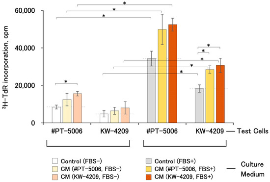 All CMs showed cell proliferation-promoting activities regardless of the combination of test cells and CM source (Figure 2). FBS-free and FBS-containing CMs obtained from #PT-5006 and KW-4209 cells showed 1.48- and 1.67-fold, and 1.45- and 1.67-fold higher activities than the non-CM control medium, respectively, although data with FBS-free CM were not statistically significant except those for the #PT-5006 cells and FBS-containing KW-4209 CM combination (Figure 2). In terms of [3H]-thymidine uptake levels, cells treated with FBS-containing CM showed the highest uptake, followed by FBS-containing non-CM control medium, serum-free CM, and serum-free non-CM control medium. The activities of CM were detectable for the other cells compared to those from which the CM was produced. The responsiveness of cell proliferation was better with #PT-5006 throughout the experiment.