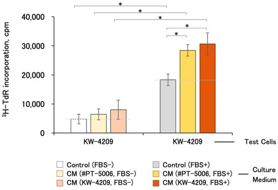 To estimate the growth-promoting activity of CM, #PT-5006 or KW-4209 cells were thawed and cultured with 10% FBS-containing MEMα for 2 h at 1.5 × 104 live cells/0.1 mL/well, 4.7 × 104 live cells/cm2 (4 wells each; 3599, Corning 96-well cell culture plate; practical cultivation area, 0.32 cm2) at 37 °C under 5% CO2. Then, cells were washed twice with 0.5 mL of saline and the medium was changed to FBS-free or FBS-containing test CMs and 37 kBq of [3H]-thymidine was added (NET027Z001MC, PerkinElmer, Waltham, MA, USA) (Figure 1b). Forty-six hours after the medium change, the cells were harvested with trypsin–EDTA solution (203-20251, Fuji Film Wako, Tokyo, Japan) and the incorporated radioactive thymidine was quantified using a liquid scintillation spectrometer (Top-Count NXT, PerkinElmer). Cell viability was determined by the trypan blue exclusion test (Gibco™ Trypan Blue Solution, Thermo Fisher Scientific, Waltham, MA, USA).