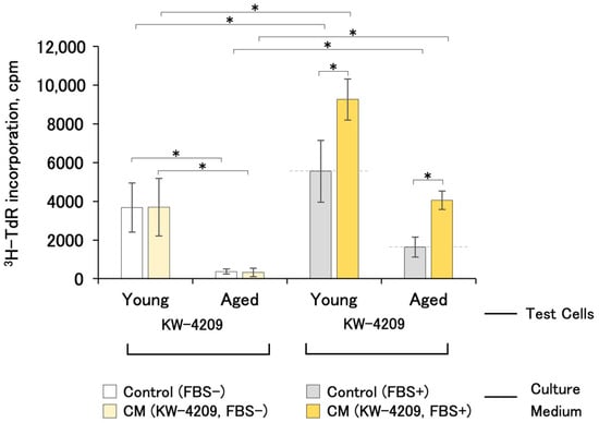 Cell-proliferation-promoting activities of CM with young and aged cells (n = 4 and 8, respectively). Due to the unavailability of cells, the experiment was performed only with KW-4209. Gray dashed line indicates the activity of non-CM control medium. Asterisks indicate statistical significance; p < 0.05 according to ANOVA and Fisher’s protected least significant difference (PLSD) test.