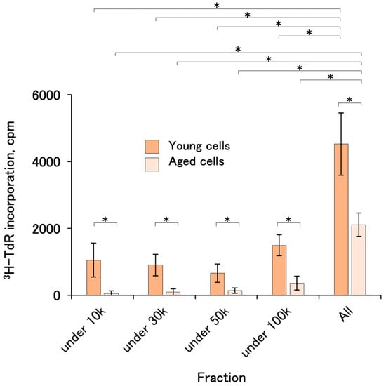 The thymidine incorporation of young and aged KW-4209 cells produced results of 3865 ± 1272 cpm and 371 ± 332 cpm (mean ± SD, n = 10) with non-CM FBS-free and non-CM FBS-containing control medium, respectively, suggesting that the aged cells showed low proliferative activities (10.1% and 29.5%) (Figure 4). Aged cells were cultured for 14 days with two passages, and the cell division number was 7.25 ± 1.15 (mean ± SD, n = 4, experimental details see also Section 4.3). FBS-free CM had no growth promoting effect on aged cells (0.85 ± 0.29-fold), whereas FBS-containing CM had a 2.30 ± 0.50-fold promoting effect.