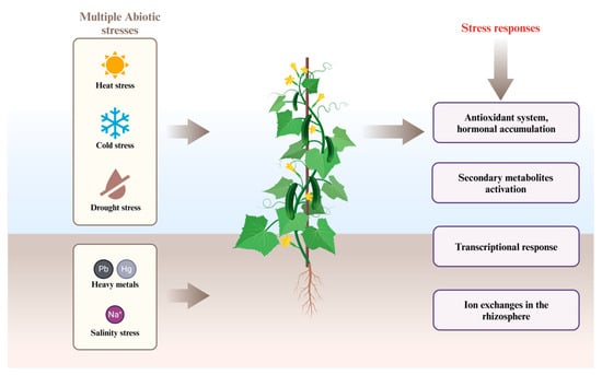 High temperature and salinity often pose a threat and thus far have been reported in several horticultural crops, including tomato, citrus, and Casuarina glauca. In general, Casuarina glauca is tolerant to salt or high-temperature stress alone but unable to cope when they happen simultaneously []. Concomitant high-temperature and salt stress conferred significant protection to tomato plants, as they alleviated the effect of single salt stress []. High transpiration evoked by high temperature neutralized the physiological response of Carrizo citrange to salt stress by hastening the leaf Cl− intake. On the other hand, combined high- and high-salt stress had enhanced or attenuated hormonal responses to regulate the complex responses to single stress []. The collective response of the plant to multiple stresses at the same time continuously varies depending on which stress comes first.