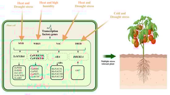 Many transcription/protein targets of post-transcriptional and post-translational modification usually are modulators of cellular processes, encompassing signaling components and transcription factors (TFs). Since transcription factors can control key downstream responses by modulating target gene transcription, they have been significant targets for elevating plant stress resistance. When TFs bind with specific cis-responsive elements in the promoters of stress-inducible genes, the entire signal transduction cascade is activated, thereby improving the combined tolerance of plants against multiple stresses []. Transcription factors are involved in the regulation of abiotic stress-related genes in plants. As the response signals are transmitted, transcription factors are activated and bind to response elements in the DNA. Here, they can act as transcriptional activators or repressors, directly affecting the expression of target genes. TFs such as MYB, NAC, WRKY, and DREB are the most frequently occurring gene families in the mechanistic investigation of transcriptional regulation in horticultural crops against multiple abiotic stresses. XsMYB44 in yellowhorn regulates stomatal closure to improve its tolerance responding to high-temperature plus drought stress []. In pepper, CaWRKY6 confers resistance to high temperature and high humidity via transcriptionally activating CaWRKY40 []. Combined heat and drought stress activates banana stress NACs, most of which are regulated by ABA []. DREB2A and DREB2C are the key TFs of tea plants in response to combined cold and drought stress [] (Figure 2).