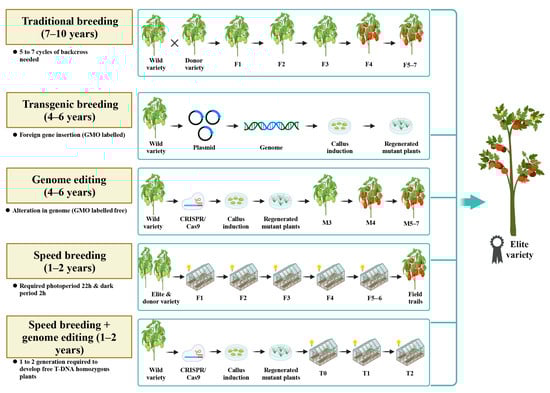 Plant species have discovered advantageous genes that have pivotal functions in augmenting plant traits. These genes have become prime targets in breeding programs to improve cultivars by employing conventional and contemporary breeding methods, such as marker-assisted selection, genetic engineering, and genome editing. Nevertheless, time consumption is a significant drawback in developing improved varieties. Traditional approaches take over a decade from the initial cross to the final release of an enhanced variety. Given these challenges, breeders must integrate various technologies to accelerate crop development. Speed breeding technology is a revolutionary approach to cultivating plants that keep up with breakthroughs in genomic technology. Speed breeding enables the production of around three to nine generations each year, resulting in the rapid advancement and introduction of new crop varieties. The combination of CRISPR and speed breeding could be a potential strategy to generate lines tolerant to multiple stresses (Figure 3). Compared to traditional, transgenic, and genome editing breeding, the combination of speed breeding and genome editing can save around 4–5 years.