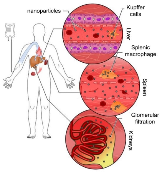The next barrier that mNPs face consists of specialized tissues, which, among other functions, purify the blood by removing foreign objects or defective cells. This process involves the kidney, albeit indirectly, as most mNPs are not directly filtered due to their size, and primarily the liver and spleen (detailed below), as depicted in Figure 1 [].