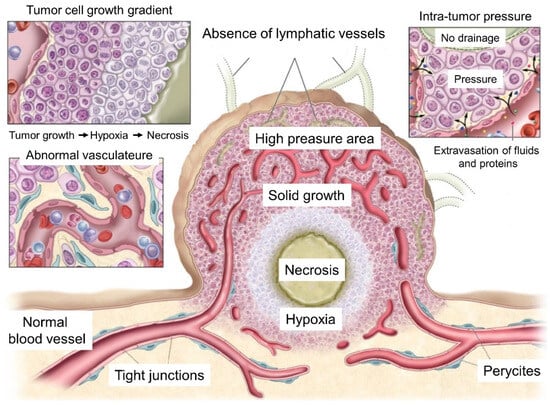 On the one hand, the physical barriers mainly consist of the extracellular matrix (ECM), which is a dense and fibrotic network of proteins and carbohydrates providing structural support to tissues []. Furthermore, increased interstitial fluid pressure (IFP) poses an additional impediment to the efficient tumor uptake of mNPs. Increased IPF is due to the leakiness of neoangiogenic blood vessels, abnormalities (tortuosity, disorganization, leakiness, compression, etc.) in tumor lymphatic vessels, interstitial fibrosis, and matrix contraction mediated by stromal []. The inefficient and poorly developed vascular network in tumors represents, by itself, a significant physical barrier for NPs to reach tumor cells [].