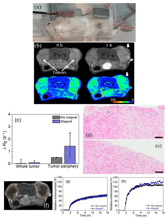 (a) Magnetic tumor targeting as a proof-of-concept experiment. (b) Representative T2-weighted MR images (top) and parametric T2 maps (bottom) at 0 and 1 h after NP injection. Thick arrows indicate the main zones of magnetically-guided accumulation of the NPs (tumor periphery). (c) ΔR2 (s−1) at the whole tumor or tumor periphery at 1 h post-intravenous administration of the NPs, calculated from the quantitative T2 map analysis. Differences were considered statistically significant at p < 0.01 (*), compared to 0 h. PB staining of histological sections of the tumors, 1 h after NP administration, and with (d) and without (e) magnetic targeting. Bar lengths: 100 μm. Representative T1-weighted MR image (f) and short-term MRI characterization of the distribution of Gadovist® in the whole tumor (g) and tumor periphery (h), drawn with orange lines, after its intravenous administration. The blue lines in g and h refer exclusively to the tumors where the NPs were targeted magnetically before. Differences in the values (%) could be attributed to minor vascularization differences in the area selected manually, which could contain a necrotic zone where Gadovist® may show a slower enhancement curve []. Adapted. Copyright (2023) Elsevier.