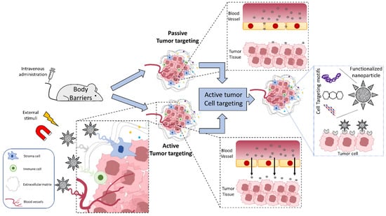 The process of tumor targeting involves the capability of mNPs to reach and accumulate within the tumor tissue, irrespective of the administration route employed or the later cellular interactions. This phenomenon underscores the crucial ability of mNPs to localize/concentrate within the tumor microenvironment (TME), thereby enhancing their potential diagnostic and/or therapeutic utility. Consequently, there is a pressing need to comprehend and optimize this process. First of all, numerous barriers hinder the achievement of sufficient doses in solid tumors following the intravenous administration of mNPs in the majority of cases.