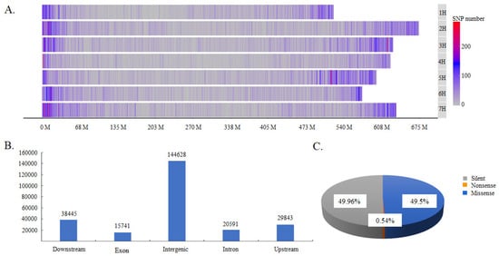 A total of 181,906 SNPs were obtained by GBS (Excel S1). They were distributed on all seven chromosomes but were distributed more frequently at the ends of chromosomes. Chromosome 7 contained the most SNPs, with a total of 31,446 SNPs that accounted for 17.3% of the total SNPs, whereas chromosome 4 contained the lowest number of SNPs, with a total of only 17,518 SNPs, which accounted for 9.6% of the total (Figure 1A). These SNPs could be classified into three types according to their effects on protein coding: silent-type SNPs, missense-type SNPs, and nonsense-type type SNPs, which accounted for 49.96%, 49.50%, and 0.54% of the total SNPs, respectively (Figure 1B). They could also be divided into upstream-, exon-, intron-, downstream-, and intergenic-type SNPs, according to their locations in coding and non-coding DNA regions. The intergenic type of SNP was the most abundant, accounting for 58.02% of total SNPs (Figure 1B). Moreover, the SNPs located in protein-coding regions could be further classified into three types, comprising missense-type SNPs (encoding a different amino acid), nonsense-type SNPs (translation terminated) and silent-type SNPs (synonymous) (Figure 1C). The missense and silent types of SNPs were present in similar proportions, accounting between them for 99.46% of the total SNPs.