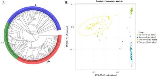 Phylogenetic tree and Principal Component Analysis (PCA) of 183 barley genotypes based on 126,687 SNP markers. (A) The phylogenetic tree constructed using the neighbor−joining method; and (B) the PCA plot, the green dots represent six-rowed and hulled barley genotypes, the blue dots represent six-rowed and naked barley genotypes, the yellow dots represent two-rowed and hulled barley genotypes, and the red dots represent six-rowed and naked barley genotypes.