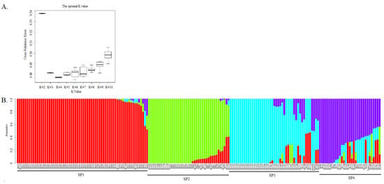 A total of 5848 SNPs, obtained by PLINK, were used for population structure analysis. The lowest CV was detected at K = 4, indicating that K = 4 was the best value for the population structure analysis (Figure 3A). It was indicated that there were four ancestry components for this barley germplasm collection, enabling the genotypes to be divided into four sub-populations (SPs), which were named SP1, SP2, SP3, and SP4 (Figure 3B). The genotypes in SP1 were six-rowed and hulled, except for B13 (two-rowed and hulled); in contrast, those in SP4 were two-rowed and hulled except for B27, B28 and B147 (six-rowed and hulled), B115 and B158 (two-rowed and naked), and B146 and B151 (six-rowed and naked). All of the genotypes in SP2 were six-rowed and naked, and all those in SP3 were two-rowed and hulled. Hence, three sub-populations were clearly distinguishable on the basis of row type and the adherence of hulls to the grains, with the two-rowed and hulled-barley types further divided into two sub-populations to make a total of four. Meanwhile, we also found that the three barley cultivars that had been bred by our lab were classified into different sub-populations, with Hua 30 and Hua 22 classified into SP3 and Hua11 classified into SP4.