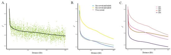 LD analysis was performed using 126,687 SNPs (i) for the whole barley collection; (ii) separately for two-rowed barleys (only one accession was two-rowed and naked), six-rowed and hulled barleys, and six-rowed and naked barleys; and (iii) for each of the four sub-populations. The squared-allele frequency correlations (r2) were used for LD estimation, and they were found to decay rapidly with distance (Figure 4A). Comparing the LD of different types of barley, it was found that the decays of the two-rowed barleys and six-rowed and hulled barleys were closer and faster, whereas the decays of the six-rowed and naked barleys were slower (Figure 4B). This suggested that the level of genetic diversity in six-rowed and naked barleys was lower than that in the first two types of barleys. Similarly, for LD comparisons of different sub-populations, the decays of the SP4 group were the fastest, those of SP1 and SP3 were similar and in the middle, and SP2 showed the slowest decay (Figure 4C). Among the four sub-populations, SP4 was dominated by two-rowed and hulled barley, SP1 was dominated by six-rowed and hulled barley, SP3 was also dominated by two-rowed and hulled barely, and SP2 was dominated by six-rowed and naked barley.