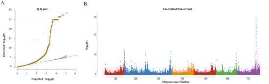 Genome-wide association scans for the hulled/naked trait and row-type trait of barley were performed using the GAPIT software (v3) with the Mixed Linear Model (MLM) [26]. Manhattan plots and quantile–quantile (Q-Q) plots were also derived using GAPIT software (v3). The threshold for significant marker–trait association was determined by both the Bonferroni-correction method and the false discovery rate (FDR) method [27,28].