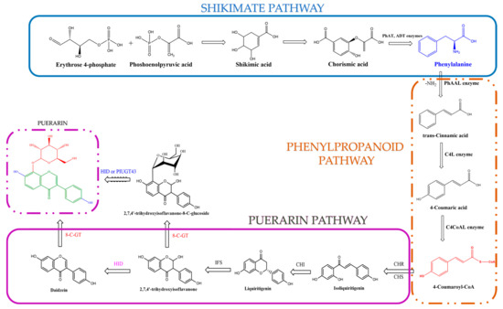 - Wang, X.; Li, C.; Zhou, C.; Li, J.; Zhang, Y. Molecular Characterization of the C-Glucosylation for Puerarin Biosynthesis in Pueraria Lobata. Plant J. 2017, 90, 535–546. [Google Scholar] [CrossRef] [PubMed]