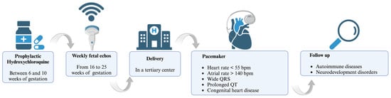 - Kaplinski, M.; Cuneo, B.F. Novel approaches to the surveillance and management of fetuses at risk for anti-Ro/SSA mediated atrioventricular block. Semin. Perinatol. 2022, 46, 151585. [Google Scholar] [CrossRef]