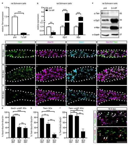 Stage-specific expression of Tle4 in undifferentiated Schwann cells. (a) Relative Tle4 transcript expression in primary rat Schwann cell cultures in proliferative conditions and after cAMP treatment to induce terminal differentiation for 7 days (7 d diff, modified from []). (b,c) Relative expression levels of Tle4, Egr2, and Mpz transcripts (b) or proteins (c) in primary rat Schwann cell cultures in proliferative conditions (prol) or after two days of in vitro differentiation (2 d diff). (b) Transcript levels were normalized to Gapdh and Rpl8 levels and the proliferative conditions were arbitrarily set to 1. Data represent mean values ± SEM. Statistical analyses were performed with Student’s two-tailed t-tests (** p ≤ 0.01, *** p ≤ 0.001). (c) Western Blot was performed on whole cell extracts of primary rat Schwann cells with antibodies or antisera directed against Tle4, Egr2, and Gapdh (Gapdh blots refer to Tle4 or Egr2 blots depicted above). Numbers on the right indicate the detected molecular weight in kDa. (d–o,s,t) Representative immunohistochemical stainings of transverse spinal nerve sections on forelimb level from wildtype mice at 13.5 days postcoitum (dpc), 16.5 dpc, and 18.5 dpc using antibodies or antisera directed against Tle4 (green), Sox10 (magenta), Sox2 (cyan (f,j,n); magenta in (s)), and Oct6 (red). Arrowheads mark Sox2/Tle4-positive, Oct6-negative cells, asterisks mark Sox2/Oct6/Tle4-positive cells, and arrows mark Oct6-positive, Tle4-negative cells (s,t). Scale bar: 50 µm. (p–r) Quantifications of immunohistochemical stainings represented in (d–o). Percentages of Sox2/Sox10-positive undifferentiated (undiff.) Schwann cells (SCs) of all Sox10-positive SCs (p), Tle4-positive cells among all Sox10-positive SCs (q) or all Sox2-positive undiff. SCs (r) are depicted as mean ± SEM. Statistical analyses were performed using Student’s two-tailed t-tests (ns p > 0.05, * p ≤ 0.05, ** p ≤ 0.01, *** p ≤ 0.001).