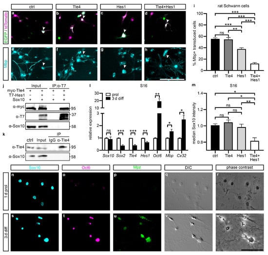 Forced expression of Tle4 and Hes1 in primary rat Schwann cells represses their differentiation. (a–i) Primary rat Schwann cells were transduced with an EGFP and tdTomato only virus (ctrl, black bar), a Tle4-EGFP and tdTomato only virus (Tle4, dark grey bar), a Hes1-tdTomato and EGFP only virus (Hes1, light grey bar) or a Tle4-EGFP and Hes1-tdTomato virus (Tle4 + Hes1, white bar). (a–h) Representative images of transduced primary rat Schwann cells differentiated for 4 days and stained for Mbp (cyan). Fluorescence of retrovirally expressed EGFP and tdTomato is shown in green and magenta. Scale bar: 100 µm. Arrowheads mark double-transduced cells. (i) Percentage of Mbp-positive cells of all double-transduced Schwann cells. Data represent mean values ± SEM. Statistical analysis was performed with a one-way ANOVA with Tukey’s multiple comparisons tests (ns p > 0.05, ** p ≤ 0.01, *** p ≤ 0.001). (j,k) Co-immunoprecipitations were performed with lysates of HEK293T cells overexpressing myc-Tle4 and Sox10 with or without additional T7-Hes1 (j), or with lysates of primary rat Schwann cell cultures in proliferative conditions (k). Precipitations were performed with anti-T7 antibody (j) or anti-Tle4 antibody (k). Subsequently, immunoblotting was performed to detect Hes1 (anti-T7 antibody), Tle4 (anti-myc antibody) or Sox10 (anti-Sox10 antiserum). The control lane (ctrl) contains lysates of HEK293T cells overexpressing myc-Tle4 and Sox10 for easy identification of endogenous protein bands (k). Numbers on the right indicate the detected molecular weight in kDa. (l) S16 cells were cultured in proliferative (white bars) and in differentiating conditions for 3 days (black bars), comparable to primary Schwann cells. The transcript levels of Schwann cell lineage markers specific to the immature state and the differentiated state were quantified in whole RNA isolations using qRT PCR. Data represent mean values ± SEM. Statistical analysis was performed with Student’s two-tailed t-tests (ns p > 0.05, * p ≤ 0.05, ** p ≤ 0.01, *** p ≤ 0.001). (m) S16 cells were transfected with a pCMV5 empty vector (ctrl, black bar), a pCAG-myc-Tle4-IRES-EGFP vector (Tle4, dark grey bar), a pCMV5-T7-Hes1 vector (Hes1, light grey bar), or both expression vectors (Tle4 + Hes1, white bar) and differentiated for 3 days. Immunocytochemistry was performed for Sox10, T7-Hes1, and EGFP as a proxy for Tle4, and Sox10 intensity was measured by flow cytometry in EGFP and T7 double positive cells. Data represent median values ± SEM. Statistical analysis was performed with a one-way ANOVA with Tukey’s multiple comparisons tests (ns p > 0.05, * p ≤ 0.05, ** p ≤ 0.01). (n–w) Representative immunocytochemical stainings, differential interference contrast (DIC), and phase contrast images of S16 cells kept for 1 day in proliferative conditions (1 d prol) or for 3 days in differentiating conditions (3 d diff) using antisera directed against Sox10 (cyan), Oct6 (magenta), and Mpz (green). Scale bar: 100 µm.