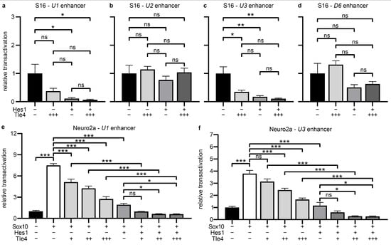 Sox10 expression in different tissues and developmental stages is regulated by various evolutionary conserved Sox10 enhancers located upstream and downstream of the Sox10 transcriptional start site [,,]. Three Sox10 upstream (U) enhancers and one downstream (D) enhancer with particularly high activity in Schwann cells are U1, U2, U3, and D6 []. Those enhancers in combination drive robust Sox10 expression in Schwann cells and, at least for the U3 enhancer, a positive feedback regulation by Sox10 was found in vitro and in vivo leading to a sustained Sox10 transcript expression in already Sox10-positive cells []. Using reporter constructs in which luciferase expression is under the control of a ß-globin minimal promoter and U1, U2, U3, or D6, we further analyzed the effect of Tle4 and Hes1 on these enhancers and the regulation of their activity. We found strong repression of U1 enhancer activity by Hes1 and of the U3 activity by Tle4 or Hes1 in Sox10-positive S16 Schwannoma cells (Figure 5a,c). A tendency for additive repressive effects of both factors in combined transfections was clearly visible as well (Figure 5a,c). Comparable repressive effects were not visible for Tle4 on the U2 and the D6 enhancer constructs, and only a tendency for weakened repression was detectable for Hes1 alone on the D6 enhancer (Figure 5b,d). In order to analyze transcriptional repression of the Sox10 enhancers in more detail, further luciferase reporter assays were performed on the U1 and U3 containing constructs in Neuro2a cells, where enhancer activity had to be induced by Sox10 transfection. Not only the U3 but also the U1 enhancer was robustly activated by Sox10 in Neuro2a cells, indicating that positive autoregulation of Sox10 expression may not only take place via the U3 [] but also via the U1 enhancer in the Schwann cell lineage (Figure 5e,f). Intriguingly, the Sox10 transactivation capacity on both enhancers was repressed by Tle4 and by Hes1 in this experimental setup (Figure 5e,f). An additive repressive effect was furthermore detectable in the presence of both factors.