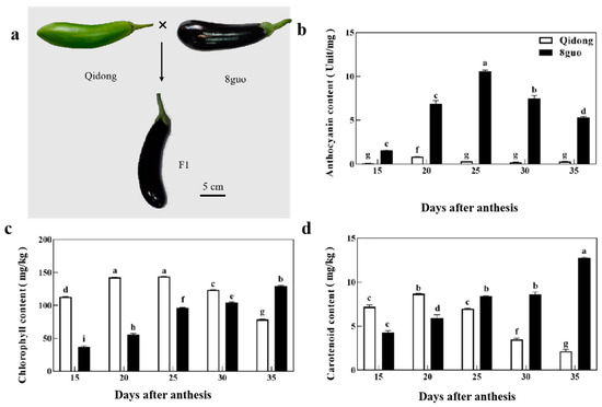 Phenotypic characteristics, pigment content of the parental peel. (a): ‘Qi dong’, ‘8 guo’, and F1 fruits. (b–d): Changes in anthocyanin (b), chlorophyll (c), and carotenoid (d) content in peel during fruit development. Significant differences were determined using ANOVA followed by Tukey’s HSD test (p < 0.05). The error bar indicates the standard deviation. Different letters above the bars indicate the statistically significant difference at p < 0.05.