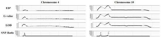DNA was extracted from fresh leaves using the cetyl trimethylammonium bromide (CTAB) method [45]. The DNA quality was determined using a Nanodrop 2000 spectrophotometer (Thermo Scientific, Waltham, MA, USA) and 1% agarose gel electrophoresis. To prepare the bulk DNA, two DNA pools were constructed by mixing equal amounts of DNA from 25 purple peel F2 individuals (purple pool) and 25 green peel F2 individuals (green pool). The Illumina HiSeq™ PE150 platform (San Diego, CA, USA) was used for double-ended sequencing of a mixed pool with 150 bp × 2 paired-end sequences. After sequencing, raw reads were preprocessed to remove adaptors and low-quality reads (bp < 20). Duplicated reads were mapped onto the reference genome of eggplant [46] using BWA software (https://sourceforge.net/projects/bio-bwa/ (accessed on 8 May 2024)) with SAM tools [47]. Single-nucleotide polymorphisms (SNP) and insertion/deletions (indels) were called and filtered by removing heterozygous and missing SNPs as well as indels in the pools and parental lines using the GATK software (https://software.broadinstitute.org/gatk/2 (accessed on 8 May 2024)) [48]. The results of the SNP ratio, ED4, G-value, and smooth LOD [49] algorithms were summarized according to the SNP site information, and the candidate regions for the association of purple peel traits were preliminarily located.