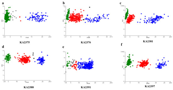 KASP genotyping variations in the F2 population. (a,b) KASP markers KA2375 and KA2376 in the candidate interval of chromosome 4. (c,d) KASP markers KA2381 and KA2388 in the candidate interval of chromosome 10 (19.11 Mb–20.31 Mb). (e,f) KASP markers KA2391 and KA2397 in the candidate interval of chromosome 10 (6.61 Mb–7.41 Mb). Green dot represents pure recessive genotypes, blue represents pure dominant genotypes, red represents heterozygous genotypes, and gray represents no template control (NTC).