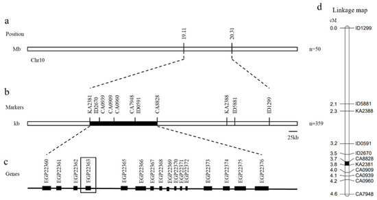 Based on the results of BSA-seq, 92 pairs of KASP, Indel, and dCAPs markers were designed and developed using the information on differential loci between parents and offspring in the candidate interval, including the indel and SNP loci. KASP genotyping results showed that the markers KA2381 and KA2388 performed well, and the candidate interval was determined to be the 1.2 Mb region (19.11 Mb–20.31 Mb) on chromosome 10 (Figure 3). Polymorphic markers in the parents and F1 were subsequently validated in the F2 population of 359 individual plants, of which 11 showed stable polymorphisms in the F2 population. The Indel markers and cleaved amplified polymorphic sequence (CAPS) markers were designed for this candidate region. The total length of the linkage map on chromosome 10 was 4.6 cm, the number of markers was 11, and the average distance between the marker was 0.42 cm. The candidate gene was located at a position of 0.1 cm between KASP marker KA2381 and dCAPs marker CA8828 (Figure 4). The physical distance was reduced to an interval of 0.35 Mb (19.20 Mb–19.55 Mb).