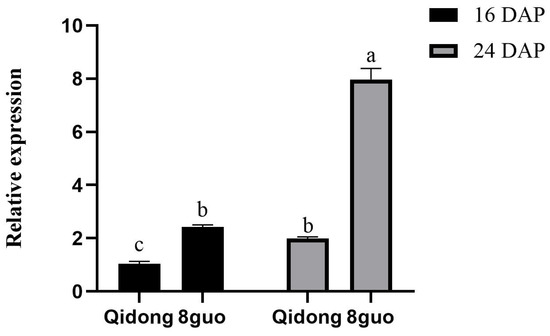 An amino acid sequence analysis of the candidate gene EGP22363 showed that a T-C mutation at position 1435 bp changed hydrophobic leucine (TTA) to hydrophilic serine (TCA) (Supplementary Figure S2). The secondary and tertiary structures of the candidate gene proteins were predicted, and the gene mutation was found to increase the coil structure in the secondary structure of the protein and change its tertiary spatial structure (Figure 5c). To reveal the expression of EGP22363 gene in eggplant peel, the eggplant peel samples of ‘Qidong’ and ‘guo’ at the early stage of growth and development, i.e., 16 and 24 days after pollination (DAP), were used for quantitative PCR (Figure 6). For ‘Qidong’ and ‘8 guo’, the expression level of ‘8 guo’ was significantly higher than that of ‘Qidong’ in the early stage of growth and development. Therefore, SmANS might regulate anthocyanin biosynthesis. We hypothesized that the EGP22363 mutation affected the function of the original protein, thereby restricting the synthesis of anthocyanins and leading to the green color of eggplant.