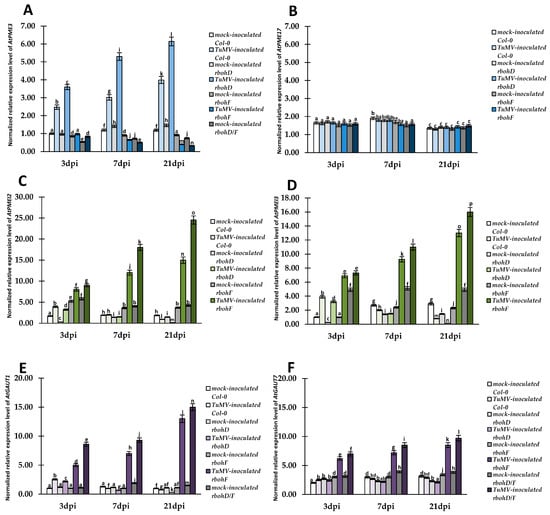 4.2. Analysis of Relative Expression of Selected AtPME, AtPMEI, and AtGSTU Genes in TuMV-Infected Col-0, rbohD, rbohF, and rbohD/F Plants Using qPCR