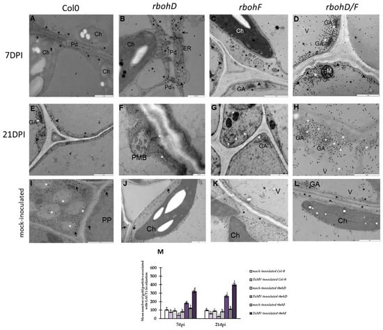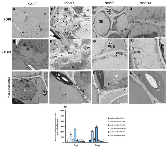4.3. Transmission Electron Microscope (TEM) Ultrastructural Analyses of Mock and TuMV-Inoculated Col-0, rbohD, rbohF, and rbohD/F Leaves