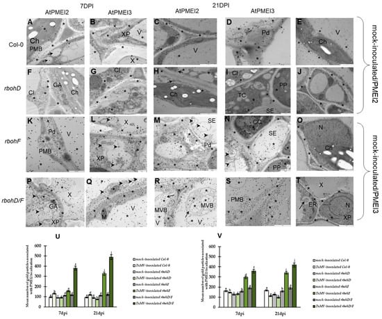 4.5. Quantified Immunogold Localization of PME3, PMEI2, PMEI3, GAUT1, and Two Types of HGs in Mock and TuMV-Inoculated Col-0, rbohD, rbohF, and rbohD/F Leaves