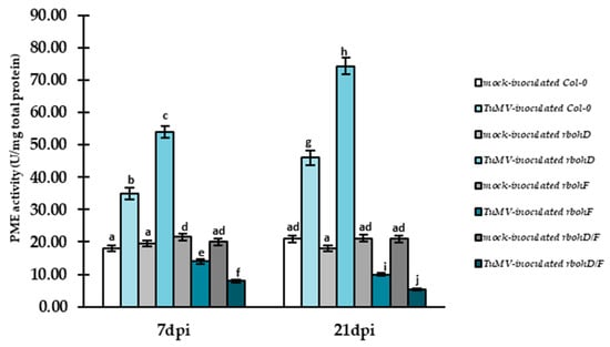 4.6. Validation of PME Activity in Leaves of Mock and TuMV-Infected Col-0, rbohD, rbohF, and rbohD/F Plants