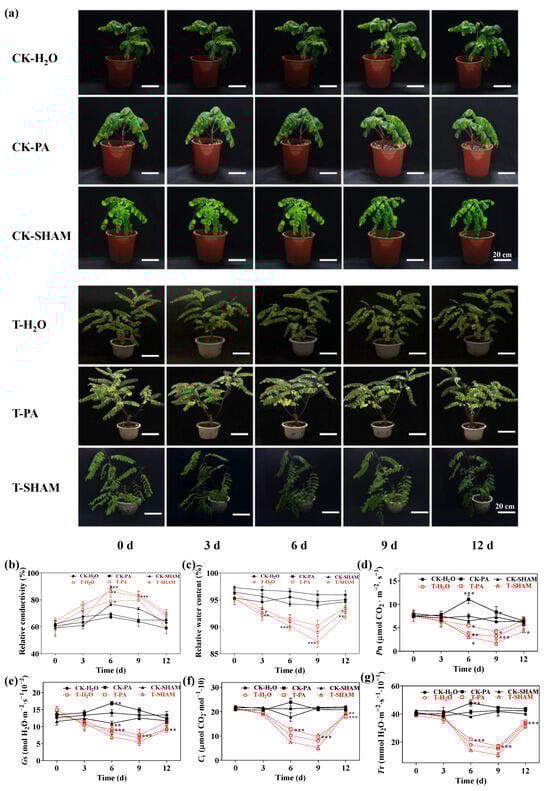 Physiological response of the tetraploid R. pseudoacacia to high CO2 concentrations. (a) Phenotypes of R. pseudoacacia under CO2 treatment. Plants were exposed to CO2 stress for 9 days and then recovered to air CO2 levels for 3 days. CK-H2O: control; CK-PA: pyruvic acid-treated; CK-SHAM: salicylhydroxamic acid-treated; T-H2O: CO2-treated; T-PA: co-treated with CO2 and PA; and T-SHAM: co-treated with CO2 and SHAM. Bar: 20 cm. Effect of high CO2 concentrations on relative electrical conductivity (b), relative water content (c), net photosynthetic rate (Pn) (d), stomatal conductance (Gs) (e), intercellular CO2 concentration (Ci) (f), and transpiration rate (Tr) (g). Six biological replicates were analyzed, and the error bars represent the SE. Asterisks indicate significant differences as determined by Dunnett’s test. (* p ≤ 0.05; ** p ≤ 0.01; *** p ≤ 0.001).