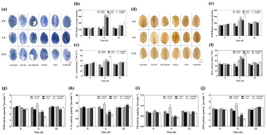 To investigate the impact of high CO2 on the antioxidant system of the tetraploid R. pseudoacacia, we initially measured the levels of H2O2 and O2·−. Under normal CO2 conditions, the levels of H2O2 and O2·− decreased after PA treatment compared to CK-H2O, whereas the levels of H2O2 and O2·− increased after SHAM supplementation. After 6 days of high CO2 treatment, the levels of H2O2 and O2·− in the leaves were significantly higher than in CK-H2O. Furthermore, after SHAM supplementation, the levels of H2O2 and O2·− were further increased compared to T-H2O. On the other hand, after PA treatment, the levels of H2O2 and O2·− were slightly decreased compared to T-H2O but were still higher than CK-H2O (Figure 2c,f). In addition, there was no significant difference in the staining intensity of DAB and NBT on the leaves before CO2 treatment. However, after 6 days of high CO2 treatment, the mean staining intensities of DAB and NBT on the leaves were significantly higher compared to CK-H2O. Similarly, the SHAM treatment increased the mean staining intensity, while PA treatment decreased it compared to T-H2O (Figure 2a–f).
