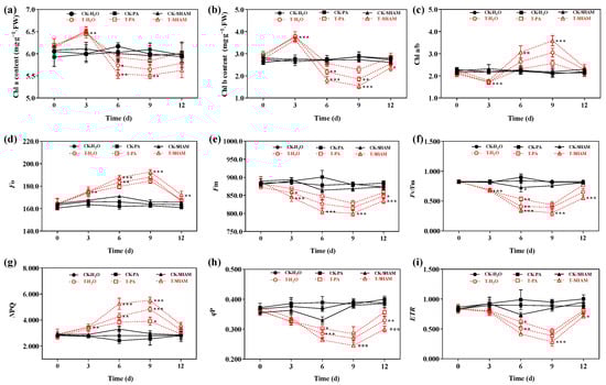 Under normal CO2 conditions, there were no significant differences in the content of Chl a and Chl b, as well as the ratio of Chl a/b, among the CK-H2O, CK-PA, and CK-SHAM groups. However, in the high CO2 treatment group, the levels of Chl a and Chl b increased, but the ratio of Chl a/b decreased compared to CK-H2O after 3 days. In the CK-PA and CK-SHAM groups, there was a significant decrease in the levels of Chl a and Chl b, while the ratio of Chl a/b significantly increased after 6–9 days. Interestingly, the T-SHAM group had lower levels of Chl a and Chl b, whereas the T-PA group had higher levels of Chl a and Chl b (Figure 3a–c).