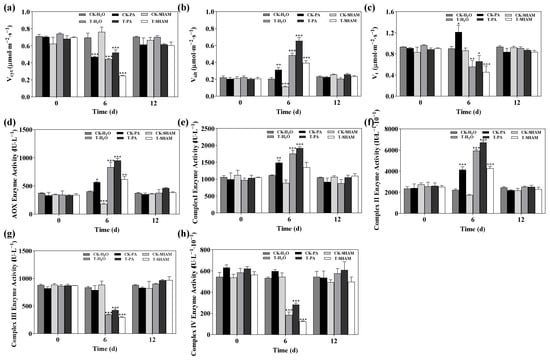 The enzyme activities of AOX, complex I, and complex II were increased by PA compared to CK-H2O. No significant changes in the enzyme activities of AOX, complex I, and complex II were observed after supplementation with SHAM under normal CO2 conditions. However, the enzyme activities of AOX, complex I, and complex II were significantly increased under high CO2 treatment. Furthermore, PA supplementation led to a more significant increase in the enzyme activities of AOX, complex I, and complex II compared to T-H2O, while the SHAM treatment also resulted in a significant increase in the enzyme activities of AOX, complex I, and complex II (Figure 4d–f). There were no significant changes in the enzyme activities of complexes III and IV, including after PA and SHAM supplementation, under normal CO2 conditions. However, under high CO2 conditions, the enzyme activities of complexes III and IV were significantly reduced. PA increased the enzyme activities of complexes III and IV compared to T-H2O, while SHAM decreased the enzyme activities of complexes III and IV. After restoration of normal CO2 conditions, the mitochondrial electron transport chain enzyme activities were not significantly different from those of the control (Figure 4g,h).