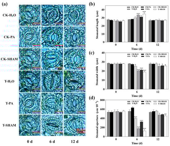 To investigate the movement of stomata in the tetraploid R. pseudoacacia under high CO2 conditions, we conducted observations on stomatal morphology and counted the stomatal apertures. When exposed to normal CO2 levels, SHAM caused stomata closure, while PA had a lesser effect on the stomata and did not significantly change the stomatal aperture compared to CK-H2O. However, under the high CO2 treatment, T-H2O showed a 67.9% reduction in stomatal apertures compared to CK-H2O. Additionally, supplementation with SHAM further decreased the stomatal apertures by 30% compared to T-H2O, whereas supplementation with PA increased the stomatal apertures by 81.7% (Figure 5).
