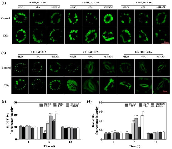 2′,7′-Dichlorodihydrofluorescein diacetate (H2DCF-DA) (a,c) and 5,6-Diaminofluorescein diacetate (DAF-2DA) (b,d) staining of guard cells under high CO2 conditions. Ten biological replicates were analyzed, and the error bars represent the SE. Asterisks indicate significant differences as determined by Dunnett’s test. (* p ≤ 0.05; ** p ≤ 0.01; *** p ≤ 0.001).