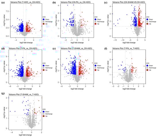 Volcano maps of differentially expressed proteins (DEPs) in R. pseudoacacia under CO2 treatment. The horizontal coordinate is log2 (fold change), and the vertical coordinate is the negative logarithm of the p-value of the t-test significance test –log10 (padj). (a) T-H2O vs. CK-H2O; (b) CK-PA vs. CK-H2O; (c) CK-SHAM vs. CK-H2O; (d) T-PA vs. CK-H2O; (e) T-SHAM vs. CK-H2O; (f) T-PA vs. T-H2O; and (g) T-SHAM vs. T-H2O. Red represents upregulated proteins, blue represents downregulated proteins, grey represents proteins with no differential change, and the dotted grey line in the middle represents the threshold line for the DAP screening criteria.