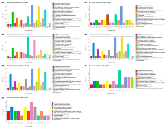 Cluster analysis of orthologous groups (KOG/COG)of DEPs in R. pseudoacacia under CO2 treatment. (a) T-H2O vs. CK-H2O; (b) CK-PA vs. CK-H2O; (c) CK-SHAM vs. CK-H2O; (d) T-PA vs. CK-H2O; (e) T-SHAM vs. CK-H2O; (f) T-PA vs. T-H2O; and (g) T-SHAM vs. T-H2O.