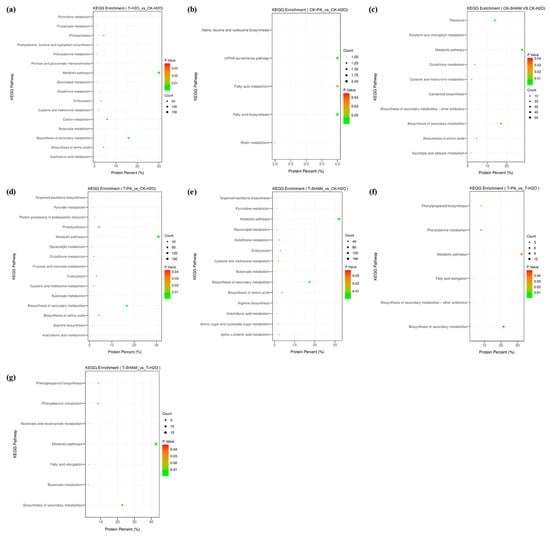 KEGG enrichment analysis of DEPs identified in R. pseudoacacia under CO2 treatment. (a) T-H2O vs. CK-H2O; (b) CK-PA vs. CK-H2O; (c) CK-SHAM vs. CK-H2O; (d) T-PA vs. CK-H2O; (e) T-SHAM vs. CK-H2O; (f) T-PA vs. T-H2O; and (g) T-SHAM vs. T-H2O. The x-axis represents the enrichment factor, and the y-axis represents the pathway of enrichment. Larger orange points represent major pathway enrichment and higher pathway impact values, respectively.