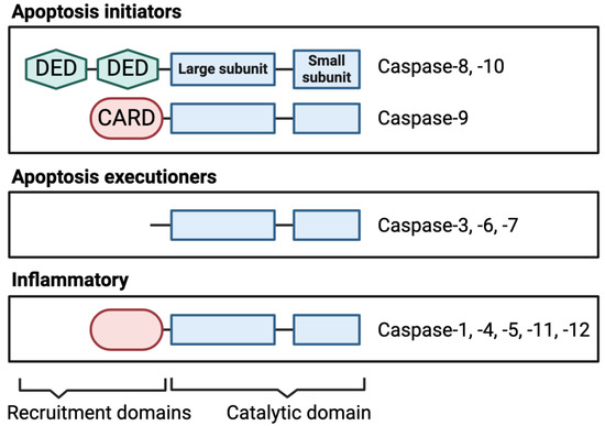 Caspase structural domains. Apoptotic caspases are classified according to their role in cell death signaling in initiators and executioners. The initiator caspases contain N-terminal death effector domains (DEDs) or caspase activation and recruitment domains (CARDs), which direct them to their activation platforms via interaction with adaptor proteins. Inflammatory caspases are those involved in pyroptosis signaling and contain a CARD similarly to the apoptosis initiator caspase-9. In their mature, active forms, the caspase catalytic domain (in blue) contains one large and one small subunit. Caspase-2 and -14 are also present in humans but they are not known to be involved in cell death or the evidence is contradictory [21].