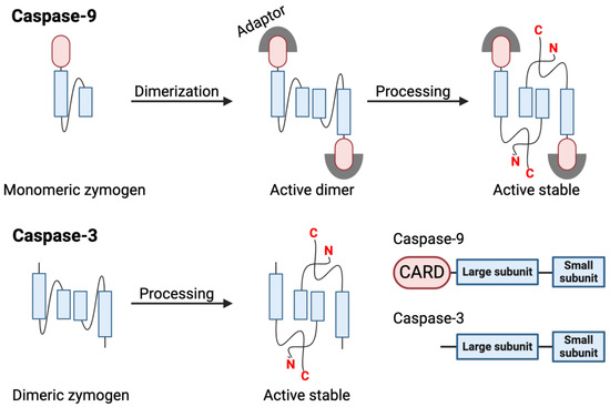 All caspases are obligate dimers in their active conformation; however, executioner (also known as apical caspases) and executioner caspases obtain their active state through different mechanisms (Figure 3). Apical caspases (caspase-8, -9, and -10) contribute with the first proteolytic signal leading to the initiation of apoptosis. Their latent forms (zymogens) are monomeric cytoplasmic proteins. These caspases contain N-terminal domains (CARDs or DEDs) that direct them to their activation modules, by means of homotypic connections to their interacting partner proteins Fas-associated via death domain (FADD) or apoptotic protease-activating factor 1 (APAF-1) [22,23]. The activation of apical caspases occurs via homo-dimerization forced by local concentration increments at their activation platforms, the death-inducing signaling complex (DISC), or the apoptosome [18,24,25,26]. Dimerization promotes a productive active site [18,25,27]. Cleavage alone is not sufficient for a full conversion into the catalytic form of these caspases [28].