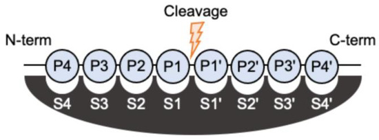 Nomenclature of substrate residues interacting with a protease active site. The amino acid of the N-terminal side relative to the cleaved peptide bond is named the P1 residue, while that on the C-terminal side is the P1’ residue. The consecutive residues in the primary structure of the substrate are numbered consecutively, taking the cleaved peptide bond as the origin [47]. Substrate residues form specificity pockets, defined by the protease sequence and structural features, that interact with the substrate residues. These sites are named with an S and are numbered following the same logic used for the substrate. Adapted from [48].