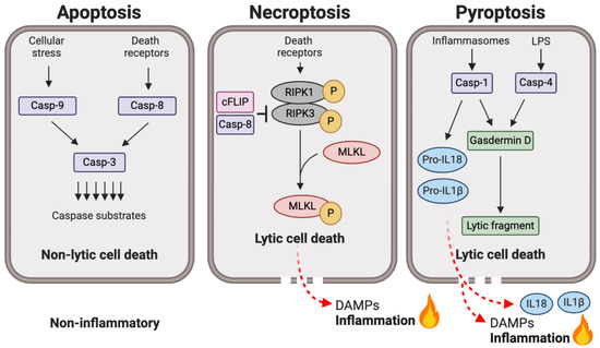 Caspases are central modulators of the complex networks that take place during the execution of the three main death programs: apoptosis, necroptosis, and pyroptosis (outlined in Figure 5). The main morphological changes that accompany apoptosis include membrane blebbing, cell shrinkage, nuclear fragmentation, and, eventually, cell death [54]. In apoptotic cells, the cellular contents are constrained by apoptotic bodies, blebs of plasma membrane, preventing their scape. In vivo, apoptotic cells are rapidly recognized and cleared by macrophages’ ‘find me’ and ‘eat me’ signals, limiting the inflammatory effects that intracellular components may trigger when released to the extracellular environment [55]. In the past, necrosis was only recognized as a mere accidental form of cell death, i.e., induced by tissue trauma. However, our understanding of regulated necrosis is expanding, with newly described pathways of cell death characterized by cell swelling, cell membrane rupture, and the release of intracellular contents: pyroptosis and necroptosis [21]. When leaked into the extracellular environments, certain cellular contents have the potential to induce an inflammatory response by activating cells of the immune system. These molecules are called damage-associated molecular patterns (DAMPs). Hence, apoptosis is considered non-inflammatory, in contrast to pyroptosis and necroptosis which promote an inflammatory environment.