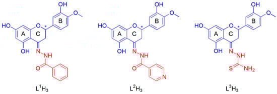 Structural formula of the free hesperetin Schiff base ligands: benzohydrazide (L1H3); isoniazid (L2H3); thiosemicarbazide (L3H3). A different color is used for the molecular moiety deriving from hesperetin (blue) and hydrazides (red). The asterisk indicates the stereogenic carbon atom in position 2 of the C ring of hesperetin.