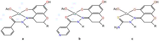 Structural formula of the complexes: (a) CuHHSB, (b) CuHIN, and (c) CuHTSC. The R group is the ring B of hesperetin with OH and OCH3 substituents on the 3′ and 4′ positions.
