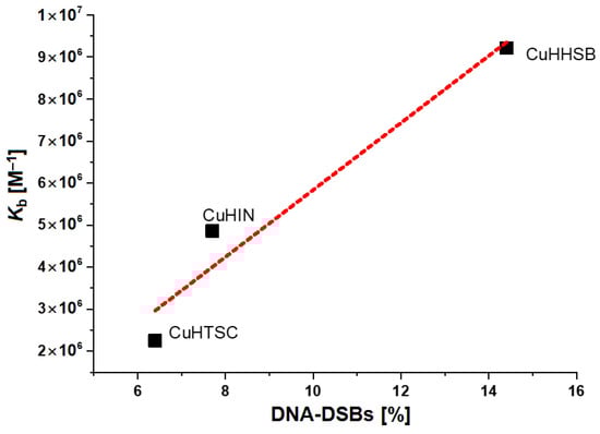 For the complexes but not for the ligands, a linear correlation was found between the values of the Kb binding constants and the DNA double strain breaks (DNA-DSBs) (Figure 5). This phenomenon suggests a different mechanism of interaction of Cu complexes and ligands with DNA.