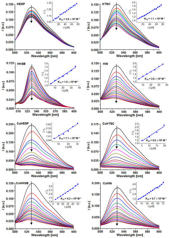 Fluorescence spectra of the DNA–TO adduct upon the addition of HESP, HHSB, HIN, HTSC, and their corresponding complexes, CuHESP, CuHHSB, CuHIN, and CuHTSC. The concentration of CT-DNA was 2.5 × 10−5 M, and that of TO was 1.0 × 10−5 M, while the concentrations of the ligands and complexes were in the range (0.5–7.5) × 10−5 M. Insets represent Stern–Volmer relationships. The arrows show the changes in the fluorescence after the addition of increasing amounts of CT-DNA.