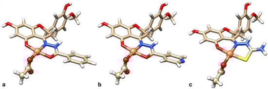 Previously published spectroscopic results suggest that, in solution, [Cu(LnH2)(AcO)] has a square planar geometry around Cu2+ ion with donors (O−, N, O/S) and the fourth coordination position filled by the co-ligand (i.e., acetate AcO−) or a solvent molecule in [Cu(LnH2)(H2O)]+, with the protons on the OH groups in positions 7 and 3′ []. The DFT-characterized structures agree with the experimental outcomes, as shown in Figure 7.