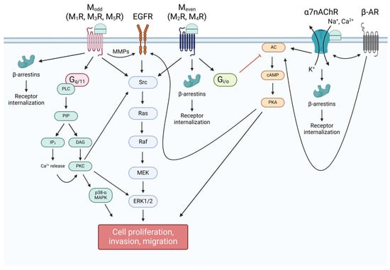 - Yu, H.; Xia, H.; Tang, Q.; Xu, H.; Wei, G.; Chen, Y.; Dai, X.; Gong, Q.; Bi, F. Acetylcholine acts through M3 muscarinic receptor to activate the EGFR signaling and promotes gastric cancer cell proliferation. Sci. Rep. 2017, 7, 40802. [Google Scholar] [CrossRef]